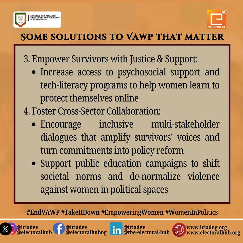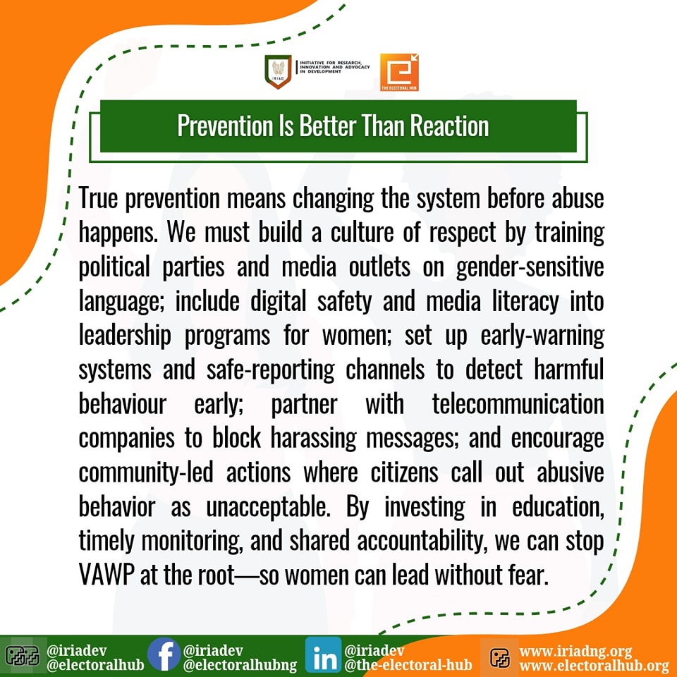 At IRIAD—The Electoral Hub, we affirm that to truly tackle VAWP in Nigeria and beyond, we must shift our focus from reactionary measures to prevention.