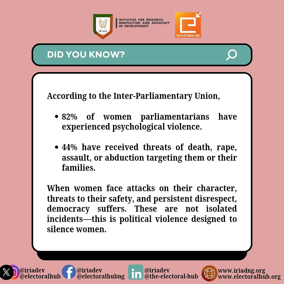 At IRIAD—The Electoral Hub, we believe that psychological violence is political violence. Leadership should never come at the cost of personal dignity, mental well-being, or physical safety. This form of abuse is designed to isolate, degrade, and ultimately push women out of politics. It is meant to silence.
