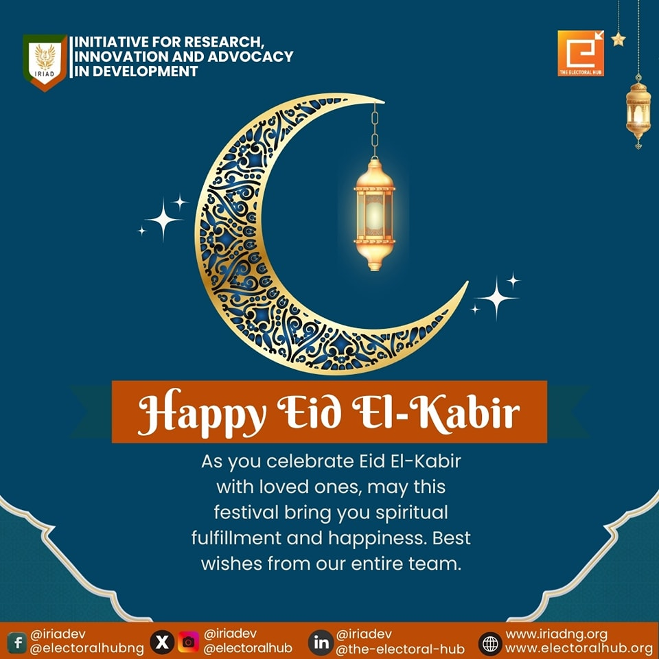 In the festive spirit of Eid El-Kabir, IRIAD-The Electoral Hub extends warm greetings to you and your loved ones! May your Salah be a source of strength, guidance, and spiritual fulfilment. Eid Mubarak!